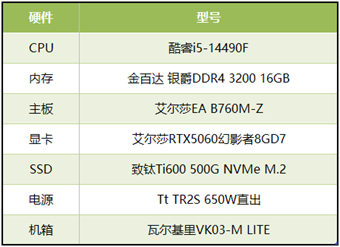 结合《仁王3》的游戏配置要求,我们准备了一套能够畅玩该作的游戏配置。从硬件的选择和搭配来看,这套配置使用的是酷睿i5-14490F处理器、B760主板以及RTX5060显卡,内存和固态分别是单根16GB的DDR4 3200以及500G的PCIe 4.0 NVMe M.2硬盘,综合性能完全可以满足《仁王3》以及其它热门单机和网游的需求。与此同时,这套配置还使用了老牌厂商艾尔莎的主板和显卡,品质方面大可放心。