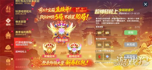 超神轻松上,2月13日-2月23日,每日前3个宝箱无需等待直接开启,除夕、初一、初二数量翻倍,前6个宝箱直接开!段位分双倍持续5局,不掉星保护整整10局,上分无忧,机会难得就是现在。