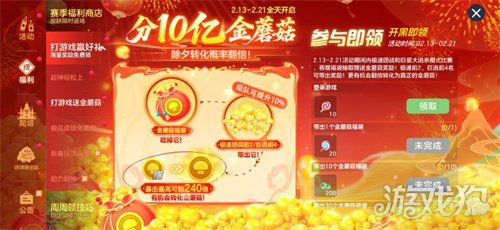 2月13日-2月21日,参与极速团战、巨星大逃杀,吞噬福袋抽取金蘑菇奖励!名次越靠前,带出奖励越多,更有机会翻倍转化为真正金蘑菇——10亿金蘑菇奖池全服共享,超大钥匙、炫彩棒棒糖等海量道具同步放送!