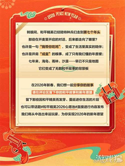 在宏大叙事之外,本次春节活动的精妙一笔,在于最终将话筒交给了玩家。在2026年新春,狂欢的最终落点并非仅是观看,而是邀请每一位玩家成为故事的讲述者与参与者。 通过#和平精英2026心愿池#征集活动,打造一个能承载真实情感、回应个体期待的游戏生态。春节营销已从短期的“事件运营”,升维为长期的“关系经营”。