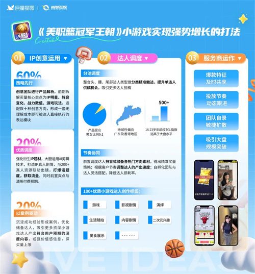 对于《美职篮冠军王朝》这类体育IP小游戏,服务商「南拳互娱」的策略则更为精准聚焦。他们自建了一批素材攻坚团队并聚合了大批供稿能力极强的达人,通过IP创意前置拆解,南拳互娱配合分层达人调度与投放节奏,搭建中台实现素材结构的快速共享、复刻与扩散,保证千次供稿的基础,协助客户达成降低付费,拉取回收的目的。