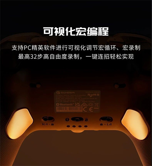 配备2颗背键,2颗小肩键,均可进行宏设置,配套PC精英软件“GameSir Connect”进行可视化调节宏循环、宏录制等操作,最高32步高自由度录制,轻松简化操作。