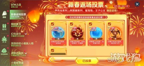 新春返场皮肤投票于2月6日至2月12日期间开启,球宝将自主决定返场皮肤!「鲨饱饱」、「甲壳虫」、「阿芙娜」已确认回归,更多皮肤由你票选。