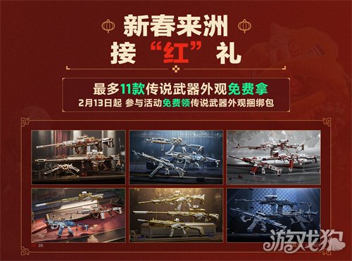 新春来洲接“红”礼!2月13日起,参与活动可领8款传说武器外观,2月16日起,参与活动可额外领取3款传说武器外观,最多可拿11款传说武器外观!