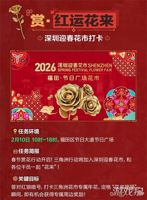新春花市,红运花来。2月10日10:00-18:00,深圳迎春花市赏花行动开启,打卡三角洲花市专属年花,答对红狼暗号,定格“花来接福”瞬间,即有机会领取游戏专属周边奖励。
