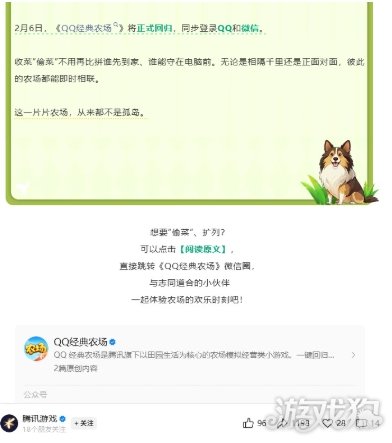 近日腾讯游戏官方发文宣布,《QQ经典农场》将于2月6日正式回归,同步登陆QQ和微信平台。终于又可以和小伙伴一起重温农场偷菜的欢乐时光了。