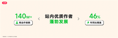 • 小红书站内优质创作者蓬勃发展,商业作者数量以46%的增速持续增长,多个垂类优质博主全面开花,渗透生活决策和兴趣爱好多个场景。