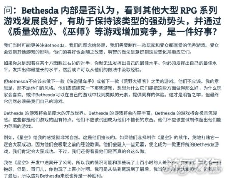 采访问题提到了《巫师》和《质量效应》,但Bruce Nesmith的回应感觉像是看不起这俩游戏,他闭口不谈《质量效应》和《巫师3》,反而认为B社应该学习下《GTA》和《荒野大镖客》