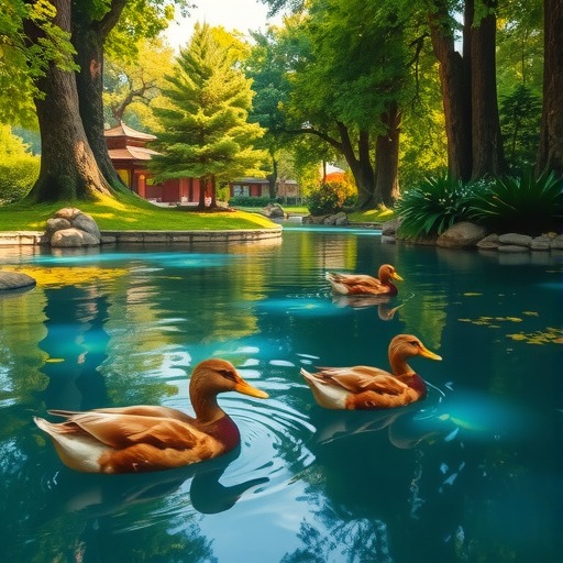 图一是棕色小鸭子的位置,在水池后面的草丛里