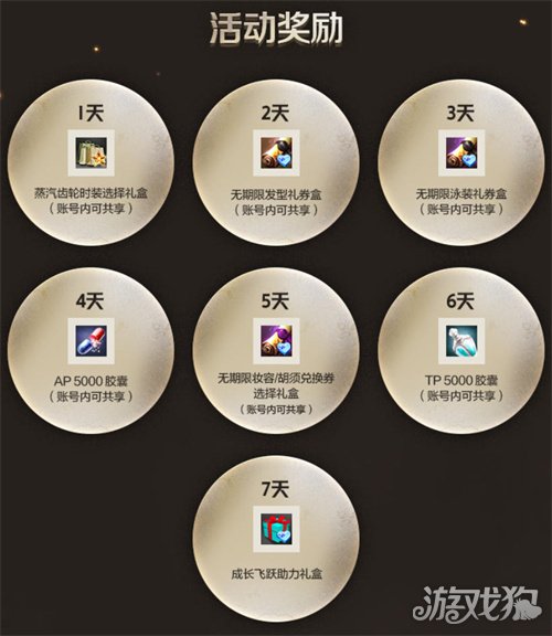签到活动也会同步开启,每日在线满30分钟,即可获得签到奖励,其中包括S级时装蒸汽齿轮时装选择礼盒、无期限发型/泳装礼券盒、成长飞跃助力礼盒等。