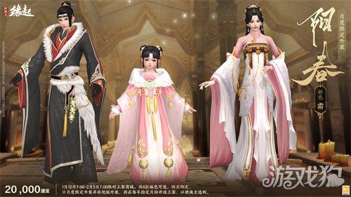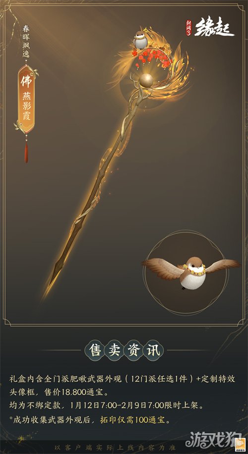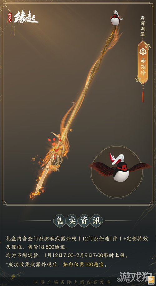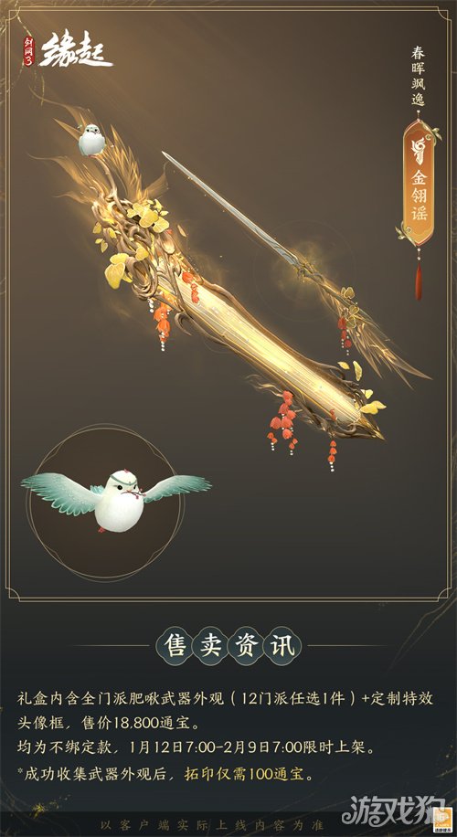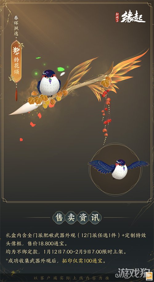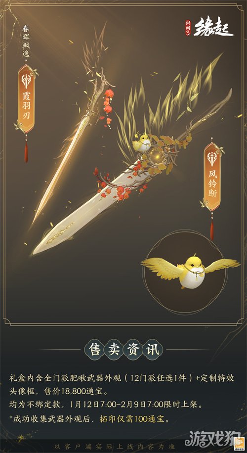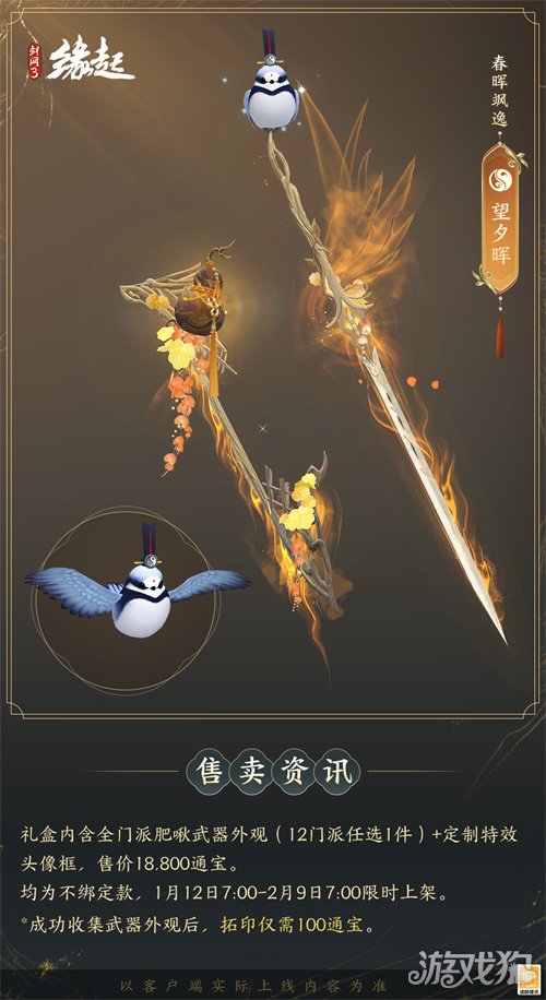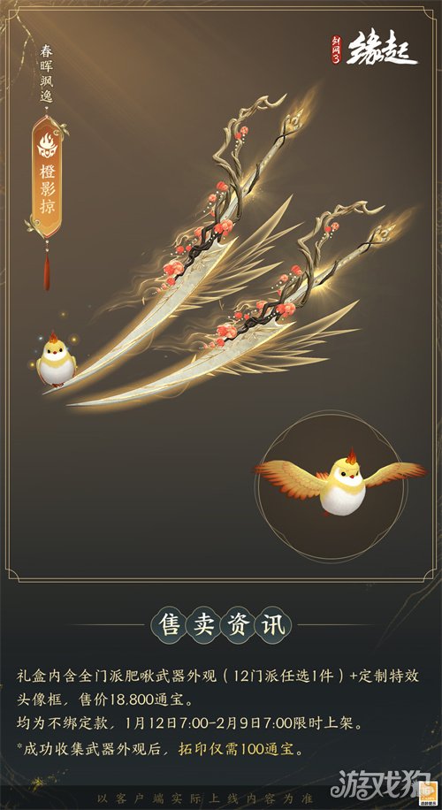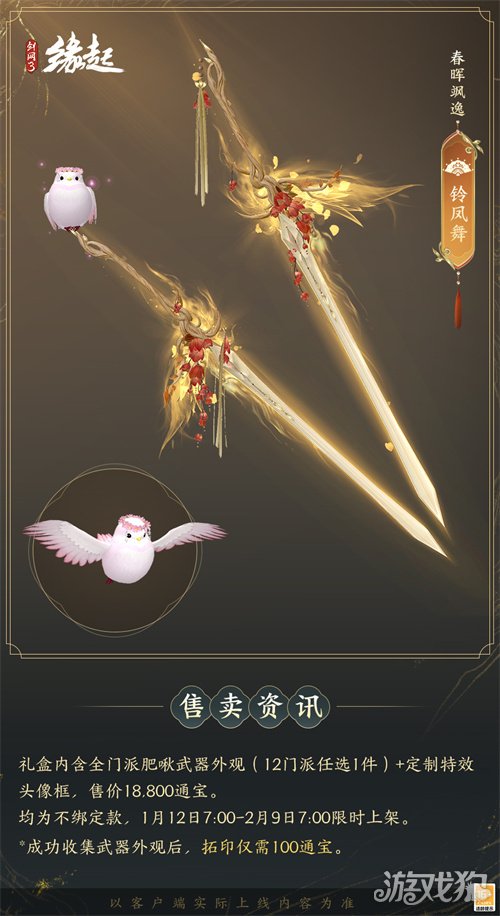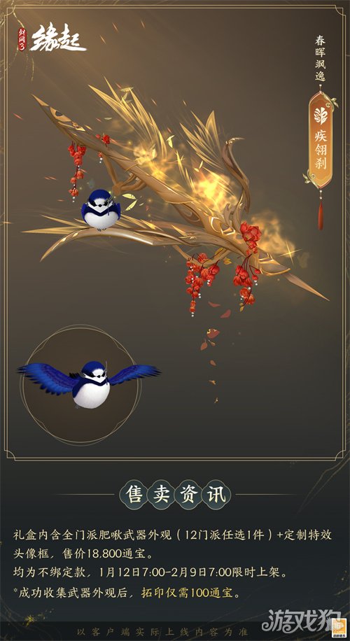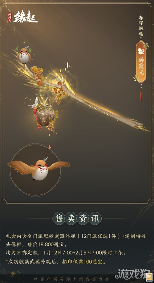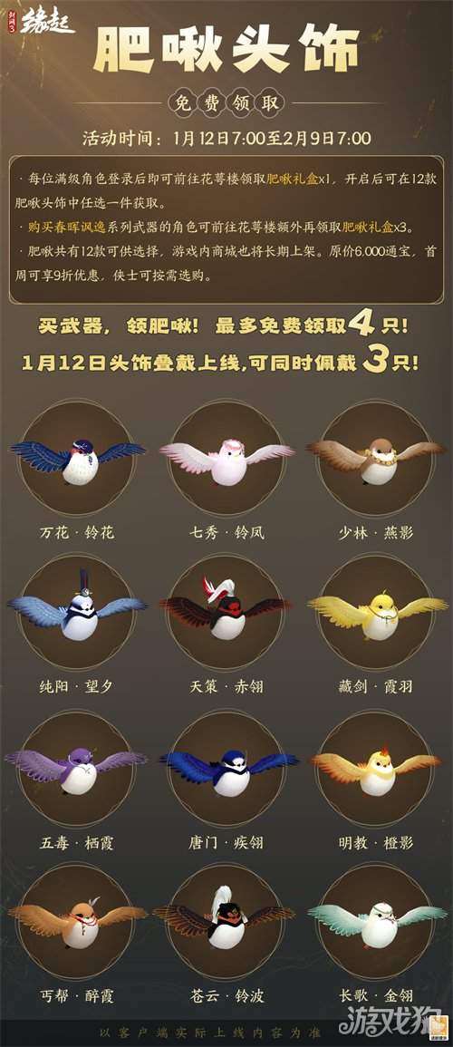 1月12日7:00-2月9日7:00,满级侠士可前往花萼楼领取肥啾任选礼盒x1,购买武器礼盒「群英论武·朝光」的侠士可额外领取肥啾任选礼盒x3!