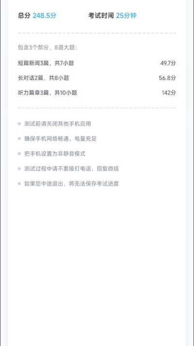 3、选定试卷后按照系统提示与考试流程进行听力测试,完成听力播放与题目作答即可进入提交与结果查看流程。