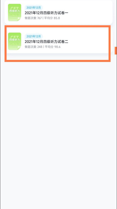 2、进入测试专区后可查看历年听力测试试卷内容列表,根据需求选择合适试卷进入练习或测试模式。