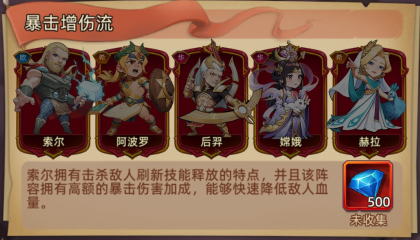 索尔拥有击杀敌人刷新技能释放的特点,并且该阵容拥有高额的暴击伤害加成,能够快速降低敌人血量。