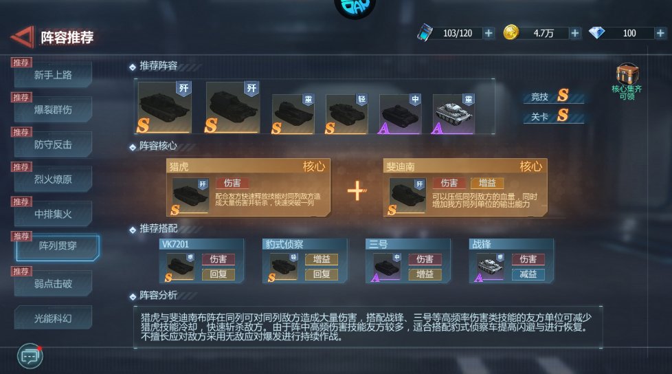 阵容组成:猎虎+斐迪南+VK7201+豹式侦察+三号+战峰