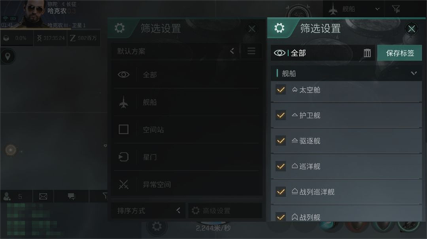 右边只有“总览”一个功能,点击眼睛图标即可打开。在这里你可以看到大部分太空中存在的物体和进入你扫描范围的其它舰船,但如果不加设置,这些乱七八糟的名称肯定会让你眼花缭乱。