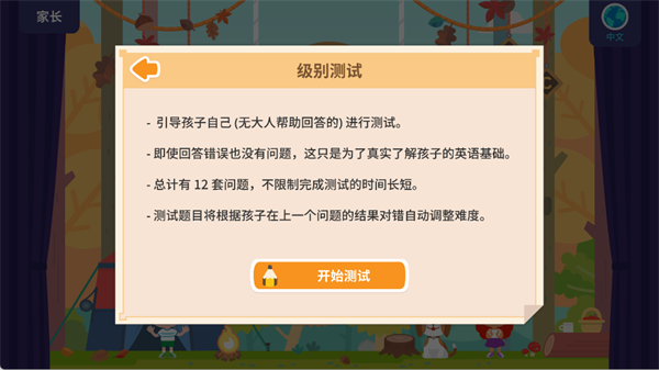 阅读测试说明,引导孩子独立完成测试,无需担心答错,测试会根据答题情况自动调整难度。
