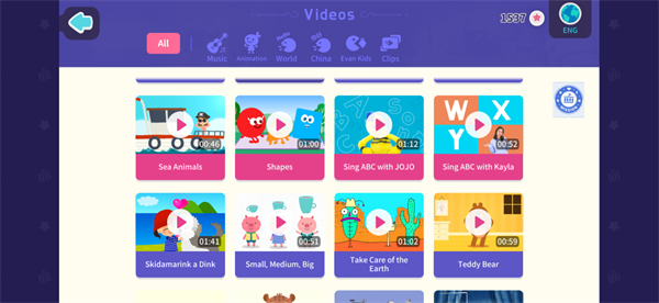 视频里有儿歌、动画、真人对话不同的形式,按主题分类。
