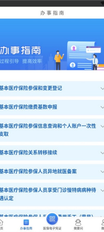 2、点击“办事指南”模块,可查看各类医保业务的详细办理流程与操作说明,便于快速了解办理步骤。