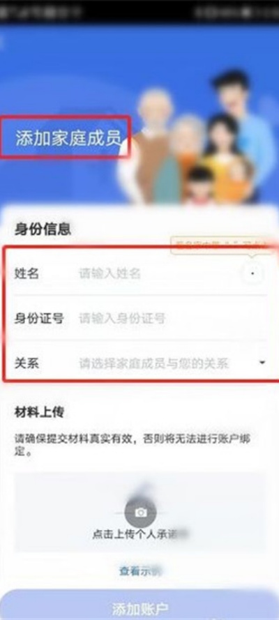 6、确认绑定方式后添加家庭成员信息,提交相关证明材料审核通过后即可完成绑定操作。