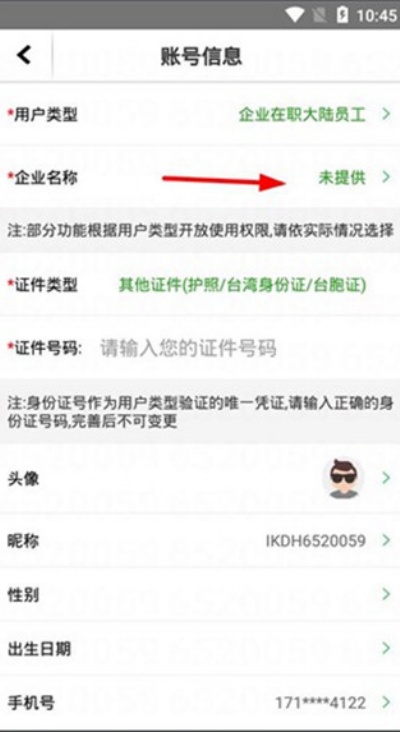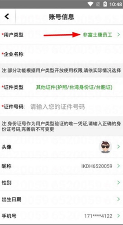 3、如果账号类型为非富士康员工,将无法选择企业名称,需要先点击“用户类型”进行调整。