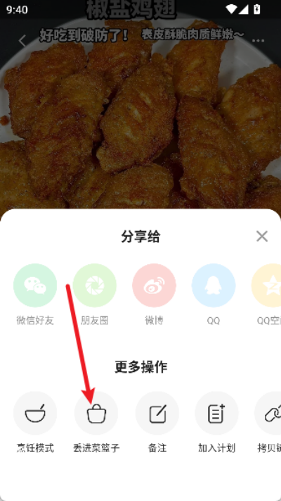 3、在弹出菜单中选择丢进菜篮子完成食材加入操作。