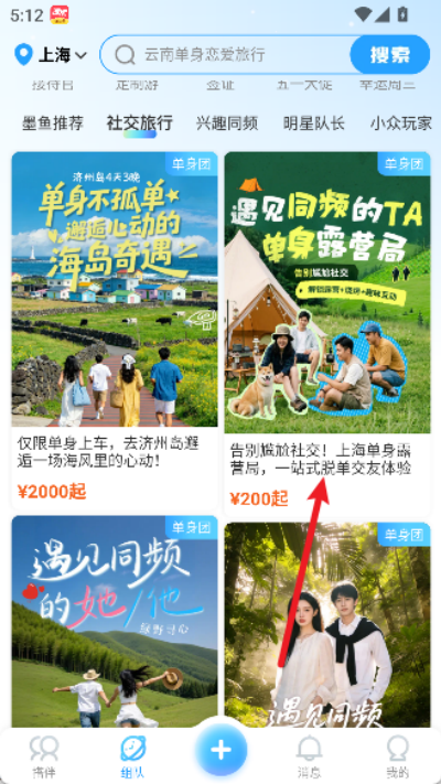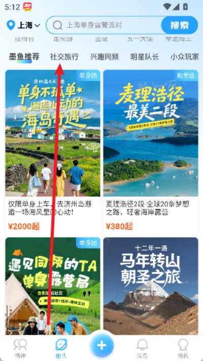 2、在组队页面中找到社交旅行选项并点击进入对应旅行列表页面。
