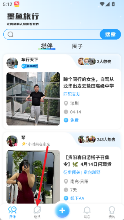 1、进入应用后点击底部组队入口进入社交旅行相关功能页面浏览内容。