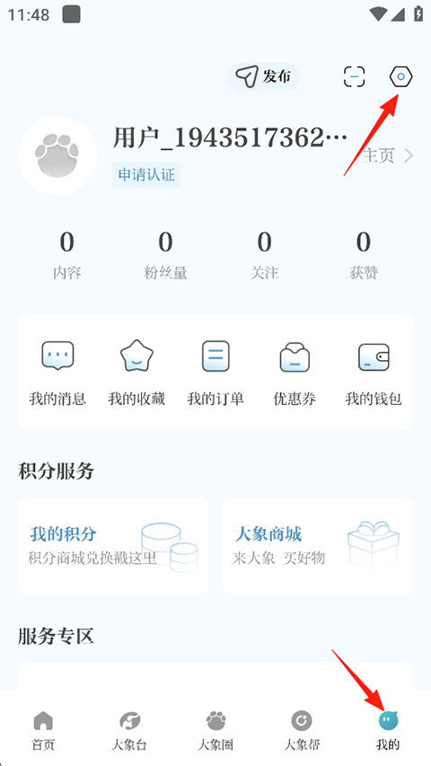 1、打开大象新闻APP,点击我的-右上角设置;