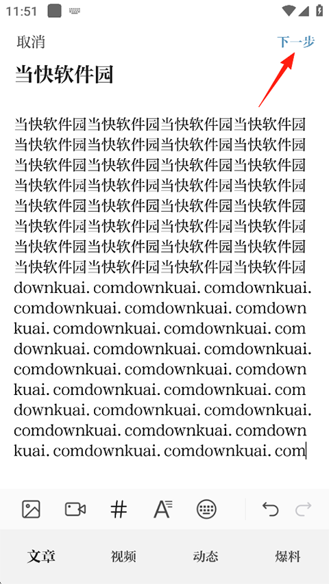 2、输入您想要投稿的内容,可以在下方添加视频图片链接等,接着点击下一步;