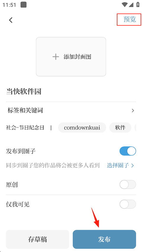 3、还可以为稿件添加封面、分享到圈子以及预览查看,完成后点击发布即可。