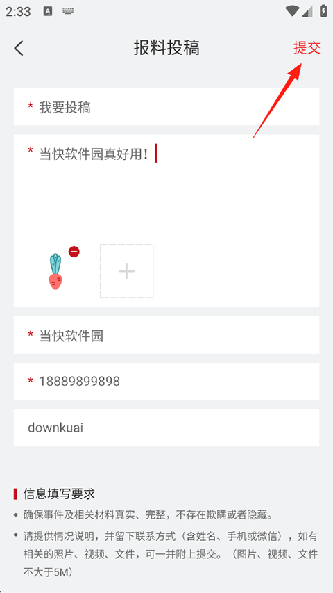 2、在此页面输入您想要发布的内容,完成后点击右上角提交按钮即可。
