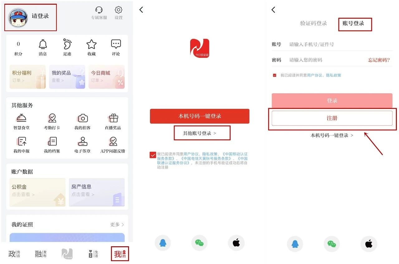 1、在【我的】板块,点击【请登录】【其他账号登录】【账号登录】【注册】完成注册。